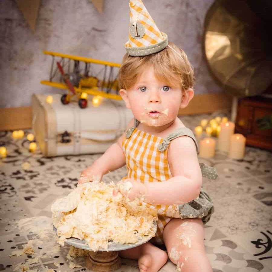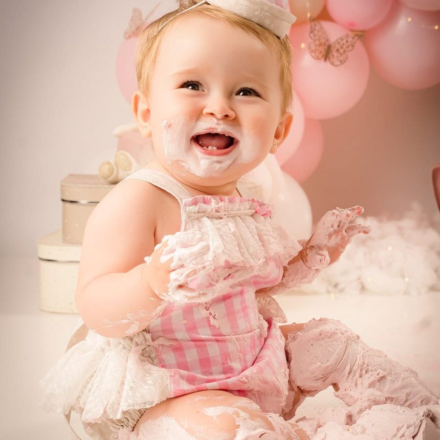 - 🎂 ¿En qué consiste una sesión Smash Cake?Es una experiencia divertida donde tu peque tiene una tarta a su alcance para hacer con ella lo que quiera: comerla, destrozarla, mancharse o simplemente jugar. Lo importante es que se lo pase en grande… ¡y vosotros disfrutéis viéndolo!¿Te imaginas a tu peque frente a un pastel precioso? Para muchos es la primera vez que prueban una tarta y sus reacciones son únicas: algunos se lanzan felices a devorarla y otros prefieren jugar con ella sin probar bocado. ¡Cada momento es pura diversión!🎈 ¿Qué incluye la sesión?La sesión dura aproximadamente 1 hora e incluye: